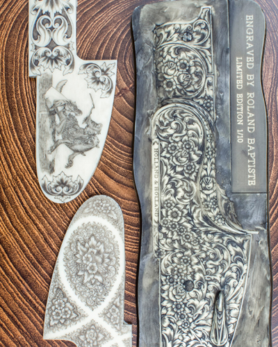 最近一位比利時的微型金雕師 R.Baptiste Engraver-Graveur想要自己製做手工金雕腕錶,寄了幾個金雕sample樣版來請Ted幫他看看;這些是鑲在槍上面的飾版文樣,雕工極精,頗不輸於時下一流品牌錶款上的金雕水準。