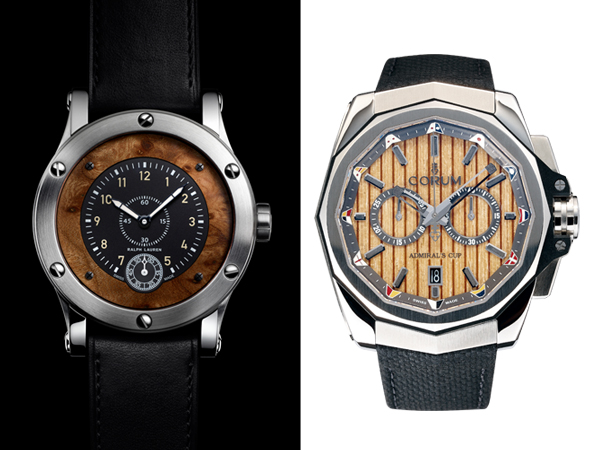 而RALPH LAUREN今年推出的Automotive Skeleton,把堅硬細密的紫檀木製成錶圈,有美麗的木頭光澤,完全由手工製成,且表面經過處理,較不容易刮傷,面盤做成鏤空,另外也有比較平價的小三針款式。還有一款Sporting Automotive 飛行陀飛輪,錶圈用榆木,整體感覺就像是把汽車的整個座駕飾板搬上錶,黑色面盤與木質錶圈的對比非常美。