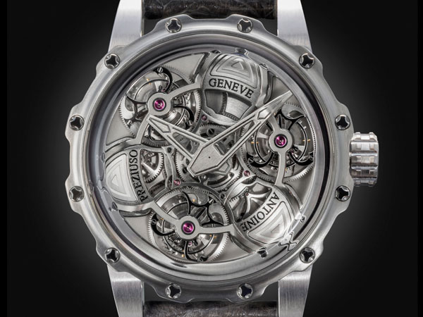 2015年度,可說是獨立製錶師 Antoine Preziuso 大放異彩的一年,推出的這枚Tourbillon of Tourbillons,不管是視覺上還是質感上均屬一流,雖然碩大的錶殼尺寸,但若看見三組陀飛輪一同運作,這可是讓人相當驚訝的,同時錶盤最外圍將配合公轉,這可說是從陀飛輪中看到卡羅素腕錶的概念,非常的複雜設計,對於這位當年瑞士製錶學校第一名畢業的高材生來說,一點也沒有太大的問題,錶殼材質上採用的五級鈦做為主材質,整體的運動風格相當強烈,這些年Antoine Preziuso大改過去風格設計,與他的兒子一同製錶,這枚可說是父子協力完成之作,意義非凡啊!!