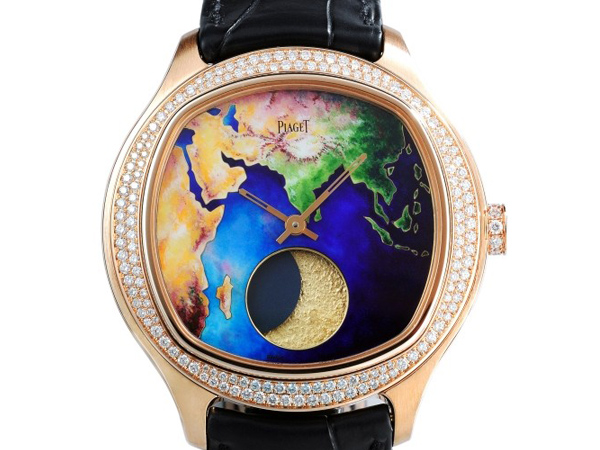 一般聽到世界地圖的錶,第一想法應該是聯想到擁有世界時區功能的錶款吧!但這款偏偏搭配的是大月相,伯爵2009年這款枕型玫瑰金鑲鑽琺瑯彩繪腕錶,有琺瑯工藝彩繪而成的五大洲及海洋面盤,它沒有日期、星期、秒針,只有六點鐘位置裝配了一枚極具引人注目的月相顯示盤,直徑大到12毫米,不管是月相盤、世界地圖面盤,都相當寫實逼真,詩情畫意。 另外補充的是,伯爵旗下這種枕型的錶殼,設計是起源1994年,方中帶圓的多層次錶殼,有別於當年時下所有的經典錶款。