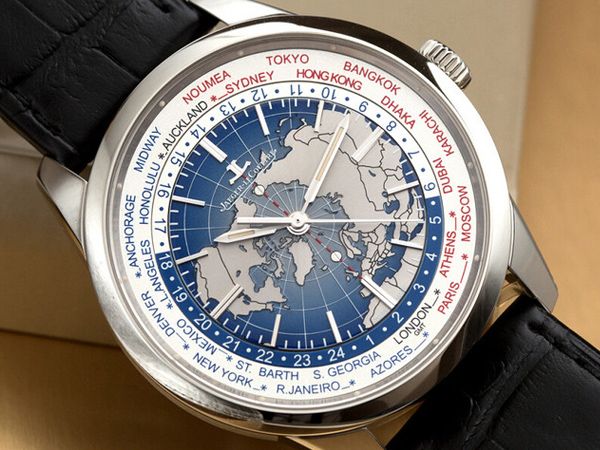 積家這款不鏽鋼的Geophysic® Universal Time地球物理天文台系列世界時間腕錶,面盤上有雕刻的太陽放射飾紋大陸、藍色漆面的海洋,它的海洋還是不同深淺色調的藍色漆面,非常精細。