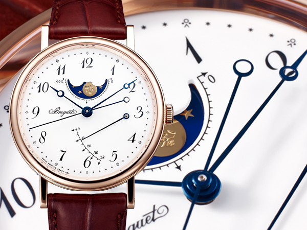 寶璣這款Classique Ref.7787 月相盈虧顯示腕錶,採用大明火琺瑯面盤,上頭有細膩雕刻而成的擬人化月相盤,而它的細長藍鋼寶璣指針非常搶眼,鮮明經典,尤其是中央大秒針,充滿新潮感。