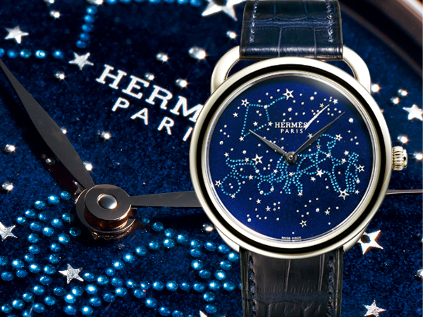 愛馬仕2012年推出的Arceau Attelage Celeste 琺瑯腕錶,是以早期懷錶為設計基礎,面盤以大明火琺瑯製作,先將愛馬仕Logo圖案串連起來,周圍再裝飾上流星,唯美夢幻,配上秀氣的柳葉指針,充滿詩情畫意。