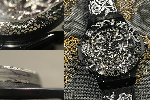 HUBLOT Big Bang刺繡腕錶,不只將刺繡圖案貼在面盤上,還融合壓進了錶圈中...細看可看到繡圖底部的薄紗質感,側面也能清楚看到融壓的痕跡。