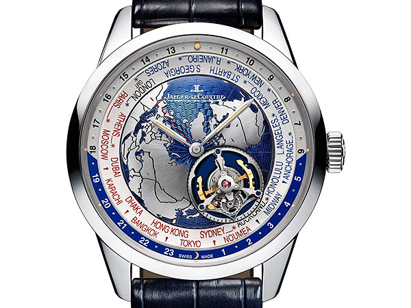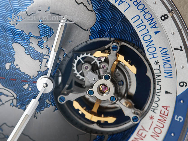 這回展示中,較為特別亮眼的一枚大作“Geophysic Tourbillon Universal Time"說它特殊之處,除了世界時區不談外,這枚腕錶的整體設計,可說是為獨特的設計,因為採取了陀飛輪圍繞著錶盤轉動的設定,這個概念便是地球自轉一圈的想法,也就是24小時繞完世界時區的想法,這概念是直覺的想法,很容易了解。