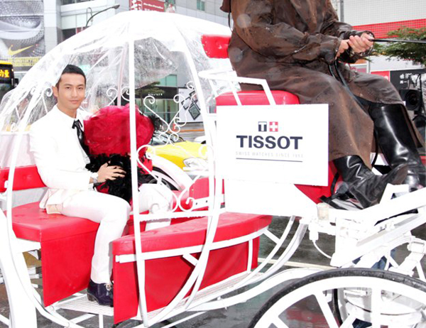 2009年底,與天梭表簽下代言合約的黃曉明,在與品牌合作滿一年後終於來台,以首位華人全球品牌大使身份,現身新光三越台北信義新天地 A11,參加天梭表新品上市記者會。針對為了久未與黃曉明見面的台灣媒體及粉絲們,主辦單位也為其特別設計了一場別開生面的進場橋段,安排黃曉明以一襲白色西裝造型,搭乘夢幻南瓜馬車,以白馬王子姿態,優雅登場,給現場所有來賓個美好驚喜。