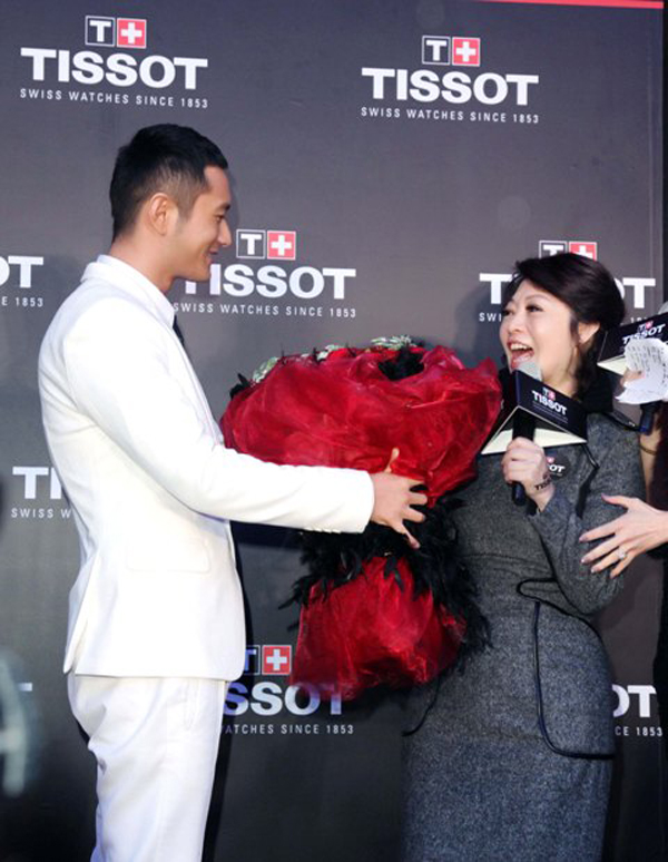 而黃曉明除了與來自瑞士的天梭表全球銷副總裁Dr. Ulrich Fischer、Swatch Group台灣分公司總經理黃孔祥,以及眾合作界面包括新光三越台北信義新天地楊宗榮店長、綺華麗鐘錶負責人陳錦坤等代表長官一同進行新品上市點燈儀式外,也特別準備了一束紅玫瑰,獻給天梭表台灣區副總經理李倩,作為感謝台灣天梭表盛情邀約的見面禮。
