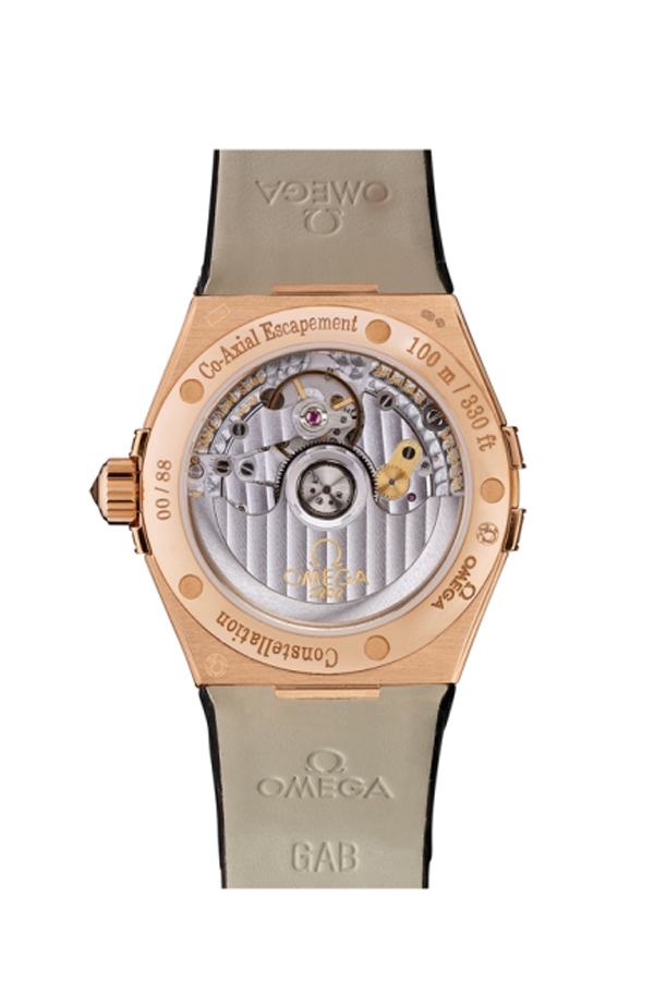 18K玫瑰金錶殼鑲鑽,6點鐘位置小秒盤外圈鑲嵌32顆鑽石,搭載歐米茄同軸擒縱2202自動上鍊機芯,動力儲存48小時,錶面直徑35mm。防水深度100米。建議售價NT708,500。