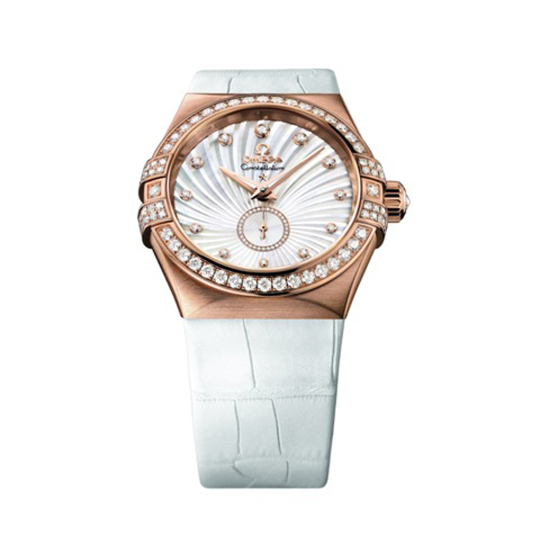 歐米茄星座系列限量女仕鑽錶,以充滿貴氣的18K玫瑰金打造錶殼與錶盤,18K玫瑰金錶盤飾以經典的放射狀星芒圖騰,細膩的玫瑰金刻紋,讓錶盤宛如精緻的藝術品般,而錶盤上鑲嵌的11顆鑽石時標,則隨著放射圖騰的擴散,從6點鐘至12點鐘的方向,鑽石的尺寸也隨著增大,展現了星座系列獨特的設計巧思。