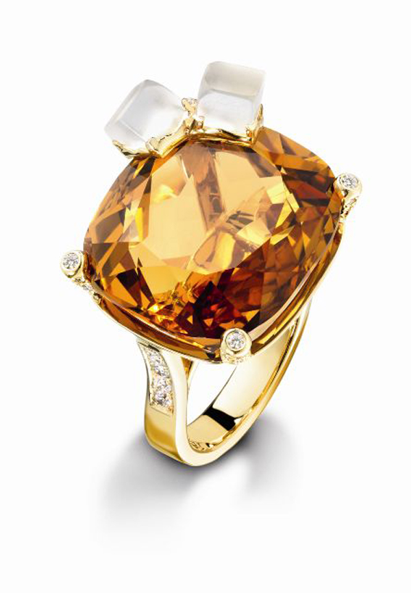 18K黃金指環,鑲嵌100顆圓形美鑽 (約重0.83克拉)、1顆枕形切割黃色晶石 (約重27克拉) 及2顆經雕琢的晶石 (約重2.64克拉)