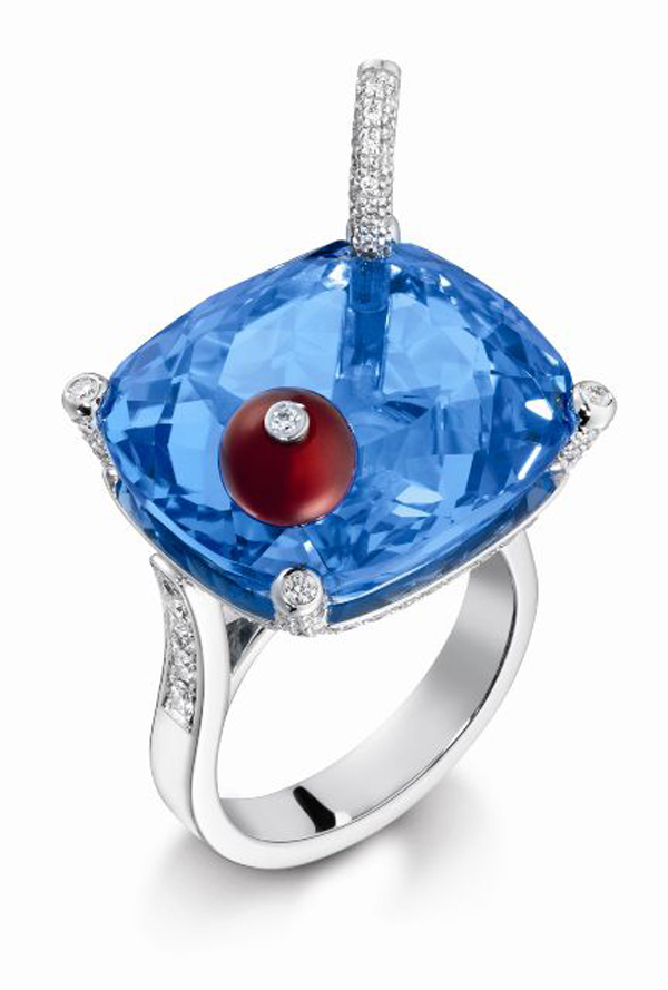 18K白金指環,鑲嵌122顆圓形美鑽 (約重0.9克拉) 、1顆枕形切割藍色拓帕石 (約重37.5克拉) 及1顆紅玉髓 (約重1.43克拉)