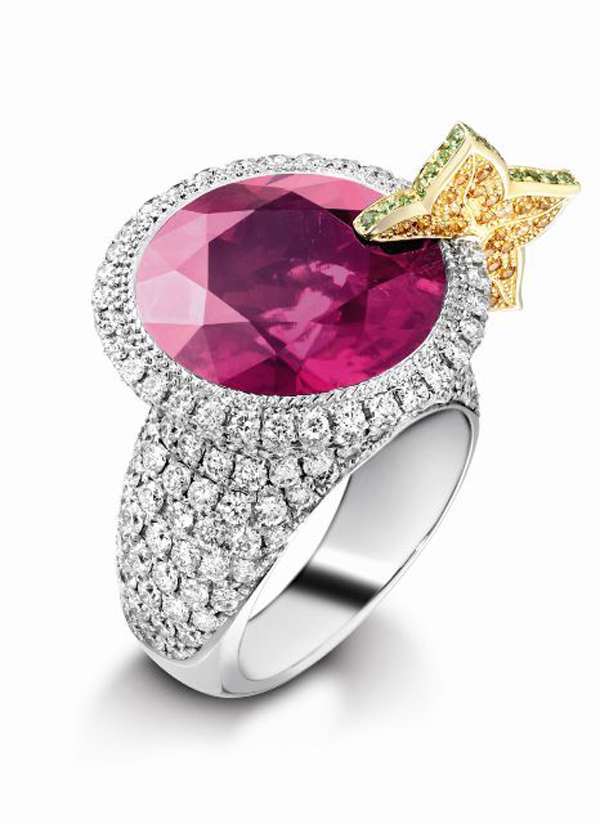 18K白金指環,鑲嵌121顆圓形美鑽 (約重0.89克拉) 、1顆枕形切割紫晶石 (約重35克拉) 、30顆圓形切割粉紅色藍寶石(約重0.31克拉)及1顆蛋面切割紅寶石 (約重0.04克拉)
