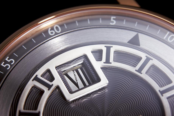 位於十二點鐘的跳時視窗,採用羅馬數字顯示,具有濃厚的古典風格。而卡地亞向來會在七點或是十一點鐘的時標上,融入CARTIER的字樣,本款腕錶也不例外。