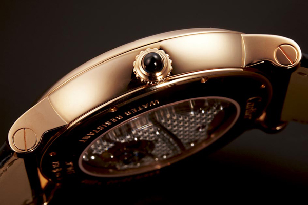 從透明底蓋上可見兩個發條盒,結合特殊的C字型快慢微調裝置,傳達出卡地亞本身的特色。