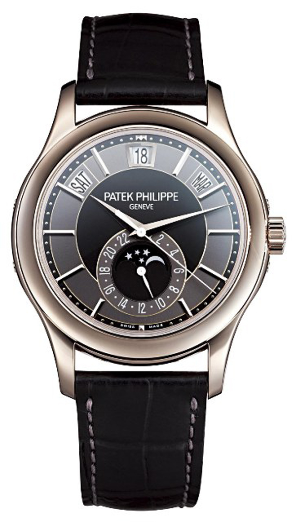 如此一來,所有重要的時間指示功能,都可在上半部面盤的弧形曲線上,快速讀取三種時間的資訊。由於這樣的設計獲頗好評,因此在2006年,百達翡麗推出的第一款自動計時腕錶Ref.5960P,便加入相同的年曆視窗設計,並增添了動力儲存顯示。