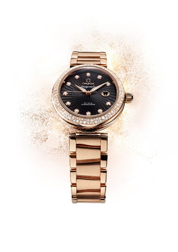 歐米茄Ladymatic仕女腕錶-這只專為女性設計打造的自動上鏈機芯腕錶;18K玫瑰金打造,搭配可完美襯托的腕錶錶帶,深邃漆黑的錶盤上鑲嵌11顆鑽石小時刻度以及日期視窗,錶圈上更以「雪花鑲嵌」的精湛工藝綴滿頂級美鑽。金與黑的大膽交錯,推薦給耀眼自信又深具個人魅力的時代新女性。