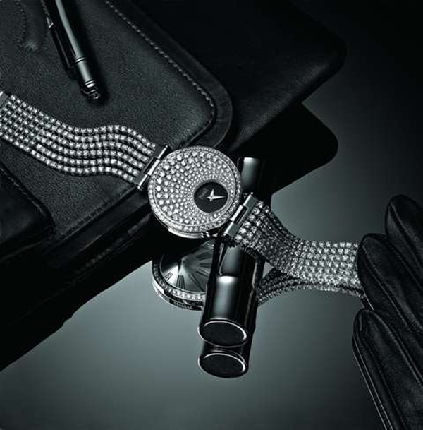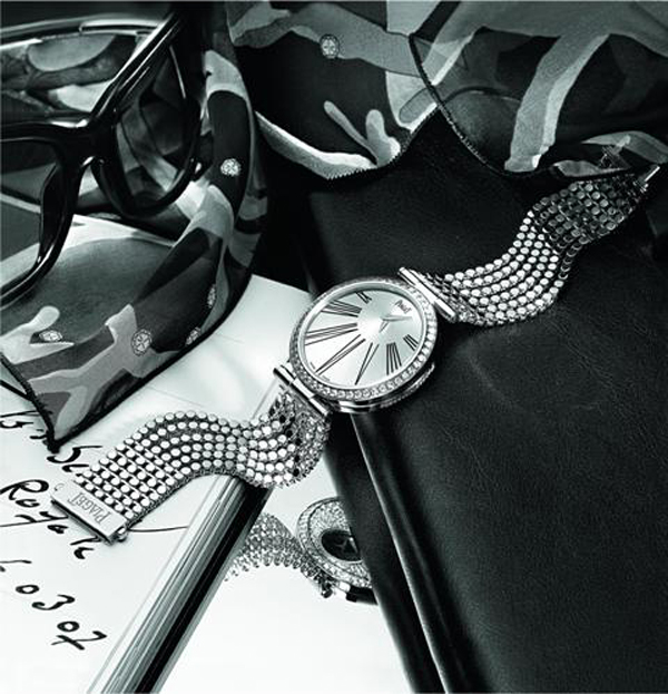 一枚腕錶,雙面錶盤 兩枚伯爵56P石英機芯 共鑲嵌680顆圓形美鑽 (約重19克拉)