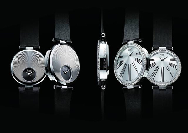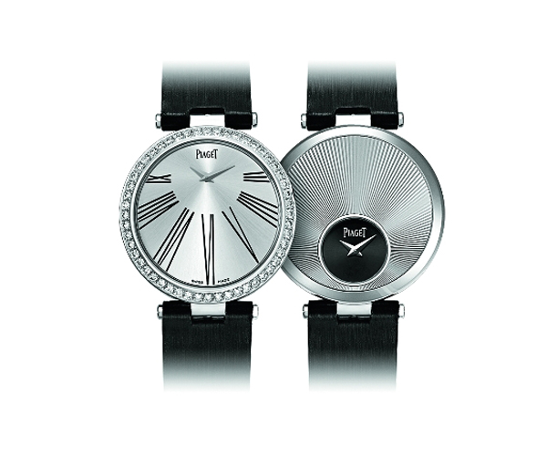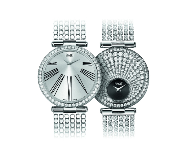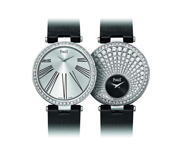 一枚腕錶,雙面錶盤 兩枚伯爵56P石英機芯 共鑲嵌106顆圓形美鑽 (約重1.4克拉)