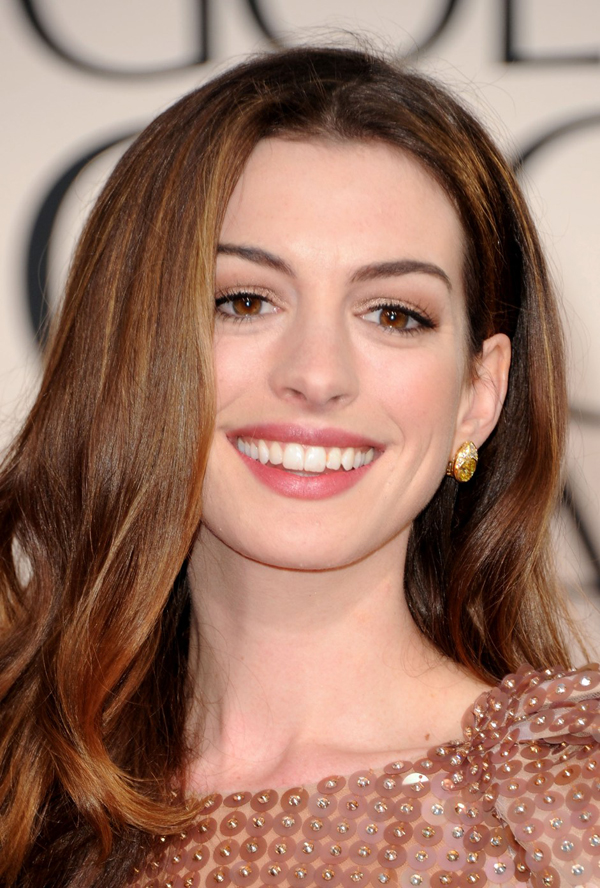 安海瑟威 Anne Hathaway 憑《愛情戀上癮》獲提名最佳電影女主角—喜劇,當日穿上一襲Amber Armani Privé 晚裝: