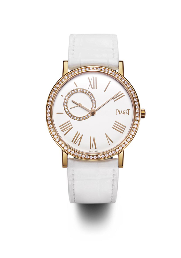 玫瑰金錶殼能防水深達30米,配搭白色鱷魚皮錶帶和獨有的玫瑰金針式錶扣。伯爵Altiplano 34毫米錶款更配有寶石鑲嵌錶圈,並備有白金款式以供選擇。