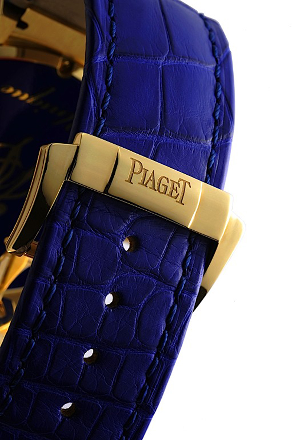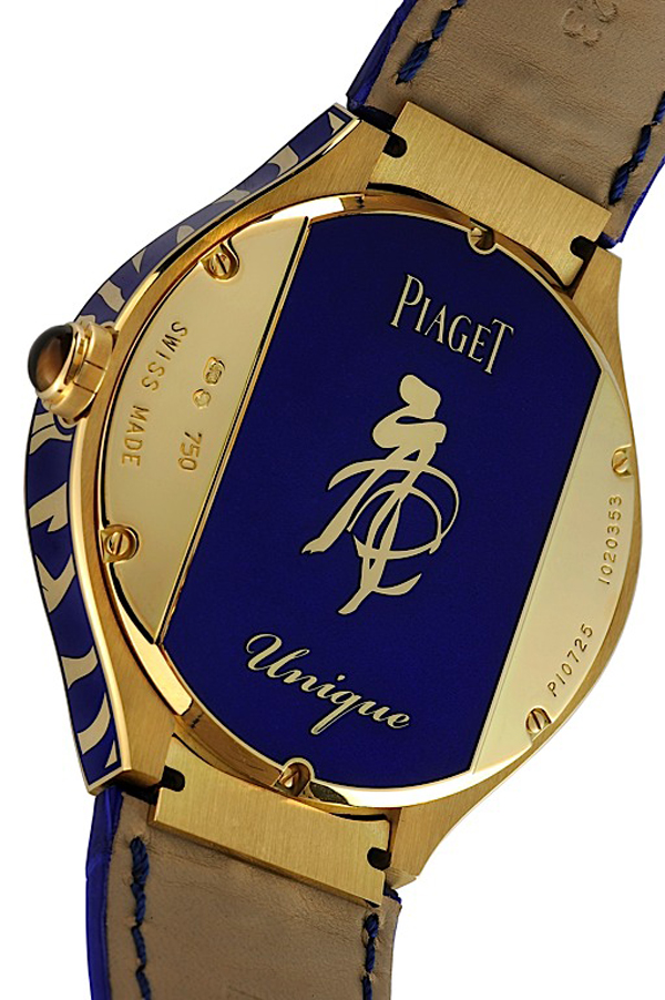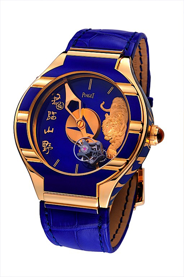 虎紋主題特殊訂製彩繪腕錶腕錶搭載由PIAGET伯爵自廠自製、在陀飛輪領域中創造非凡地位的伯爵相對陀飛輪608P手動上鍊機芯。將陀飛輪框架置放在分針尾端,每一分鐘陀飛輪框架會自轉一圈,並跟著分針每小時在面盤移動一圈。以三隻鈦金屬打造的陀飛輪框架裝置在日內瓦波紋裝飾的機芯內,機芯亦備有藍鋼螺絲、錶橋夾板倒角處理等裝飾完工。錶殼以18K黃金材質打造並以內填琺瑯彩繪技巧完成,PIAGET伯爵相對陀飛輪虎紋主題彩繪腕錶,特殊訂製款式,限量一只。