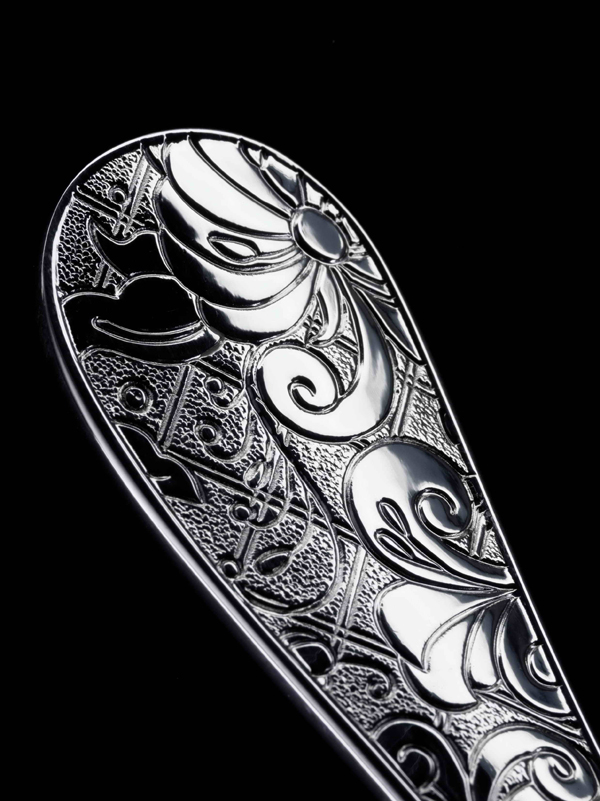 仔細觀察餐具上的雕工,浮紋雕花如同是傳統拋光表面與獨特顆粒暗紋技術的完美結合。