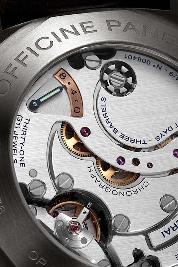 P.2004/9手動上鏈機芯配備三個發條盒,可提供8日動力儲存。此外,它還具有秒針歸零裝置,這樣可將腕錶與參考時間信號精確校時。在機械結構方面,此機芯更配備了超卓計時腕錶必備的導柱輪和垂直離合裝置。