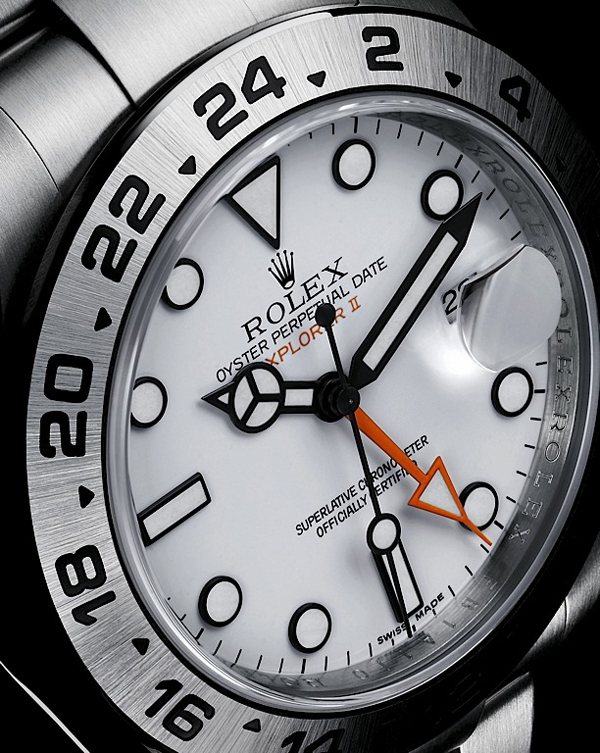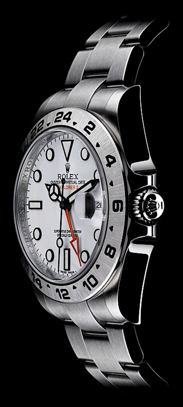 EXPLORERII 另備有黑色錶面,營造出神秘的「phantom」效果,同時令夜光指針在錶盤上活靈活現,外形更為立體化,這亦是向經典型號的一項致敬。腕錶設有可獨立調校的跳時指針,與 24 小時指針及外圈一起運作時便能提供格林威治腕表顯示第二時區時間功能。