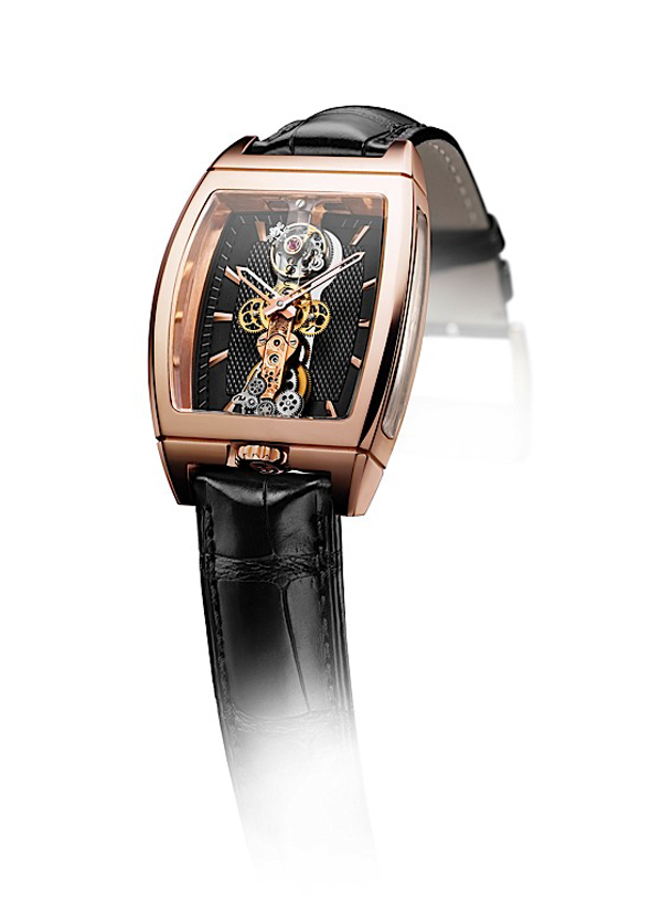 刻有guilloché 飾紋的K金製面盤置於機芯後方,鏤空的錶殼能完整的由錶殼後方觀看CO 213機芯的精密運作,並具備了有30米的防水深度;金橋陀飛輪整體呈現出宛如陳列者珍貴的透明珠寶盒,使長條型的陀飛輪機芯一覽無疑。