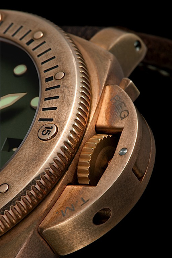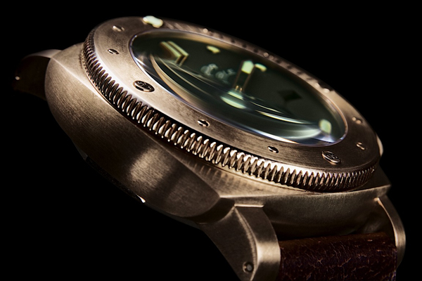 沛納海為全新Luminor Submersible錶殼所選用的青銅屬CuSn8,是銅與純態錫的合金,具有極佳的抗海水和大氣因素腐蝕的能力。除具有極高的結構強度外,這種材質還保留了原材料柔和的色調;而隨著歲月的流逝,其表面形成的綠鏽色澤更營造出一種古樸的感覺。