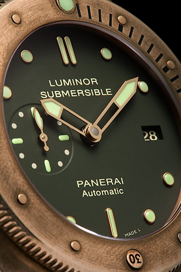 錶盤沿用Luminor Submersible腕錶的標誌性外觀設計,棒狀時標取代數字鑲嵌在12和6點鐘位置,而其特殊的深綠色調則與錶殼的青銅色澤完美配搭。錶盤裝配藍寶石水晶玻璃錶鏡,鏤空式指針具有極佳的夜光效果,9點鐘位置設有小秒盤,而與其相對稱的位置上則設有日期視窗。