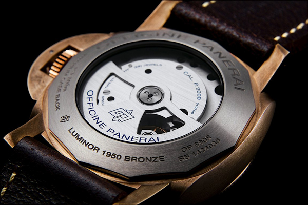 P.9000機芯採用¾夾板結構,在透明錶底蓋下清晰可見,其直徑為13¾法分,兩個發條盒可提供3日動力儲存。Luminor Submersible 1950 3 Days Automatic Bronzo – 47 毫米3日動力儲存自動專業潛水青銅腕錶型號