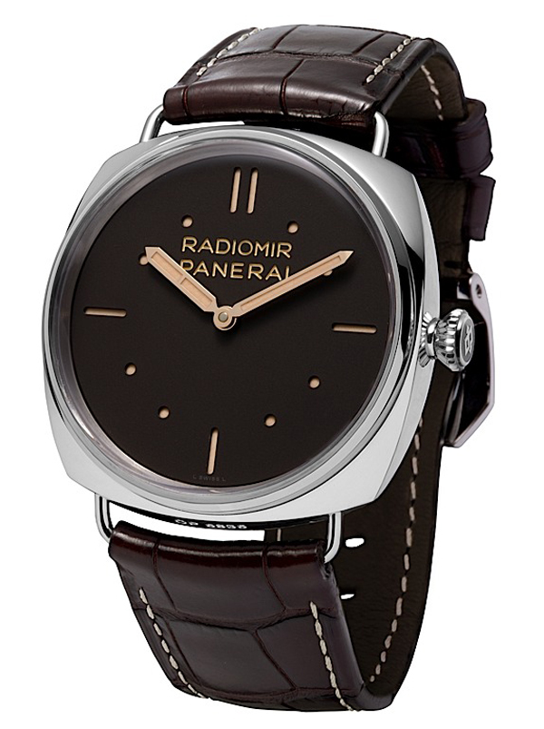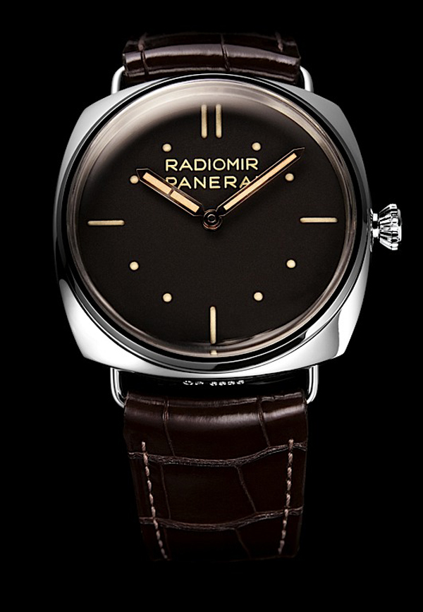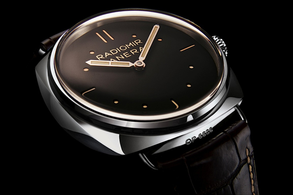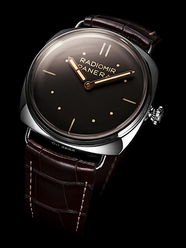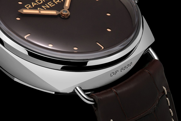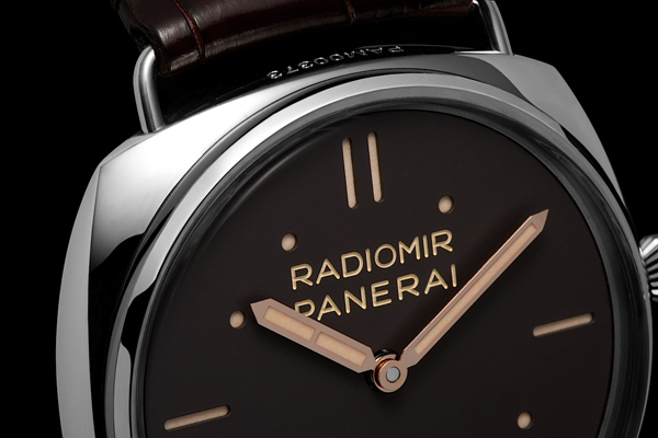 裝配Plexiglas®樹脂玻璃的全新Radiomir腕錶棕色錶盤,其外觀極為簡練,棒狀時標與圓點時標示交替呈現,12點鐘位置為雙條桿,而3、6及9點鐘位置則為單條桿,完全顛覆了經典沛納海錶盤在這些鐘點位置上的標誌性大型數字設計。