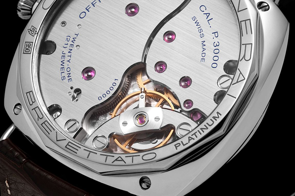 Radiomir 3 Days Platino - 47毫米3日動力儲存鉑金腕錶搭載了完全由位於諾沙泰爾的沛納海錶廠自主設計、製造的P.3000機芯。此機芯直徑達16½法分,並裝配21顆寶石和13.2毫米平衡擺輪,通過調整其邊緣上的螺絲即可快速調節擺輪的速率。