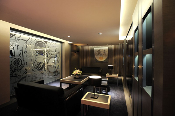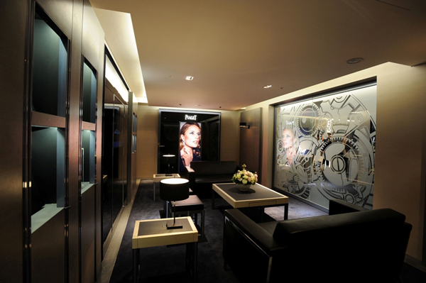 全新設計的半開放式VIP鑑賞室,14坪大的空間裡,在顧及賓客極致尊榮的服務及絕對購物隱私之餘,採半開放式的空間陳設,以噴沙半透明玻璃門延伸出寬廣視覺的舒適度。同時,每一處的裝飾細節均展示著伯爵發展頂級自製機芯的堅持與造詣:如牆上張掛由法國名插畫家Jérôme Toret所繪製的880P機芯插畫,或半透明門上與其外黑色玻璃牆板上兩兩對應的機芯圖。