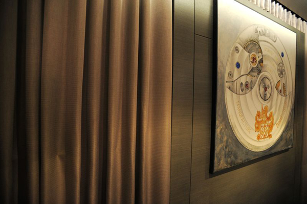 精心佈置的VIP鑑賞室,張掛由法國名插畫家所繪製的880P機芯插畫,半透明門上繪製機芯齒輪圖,均展示伯爵頂級製錶工藝之美。