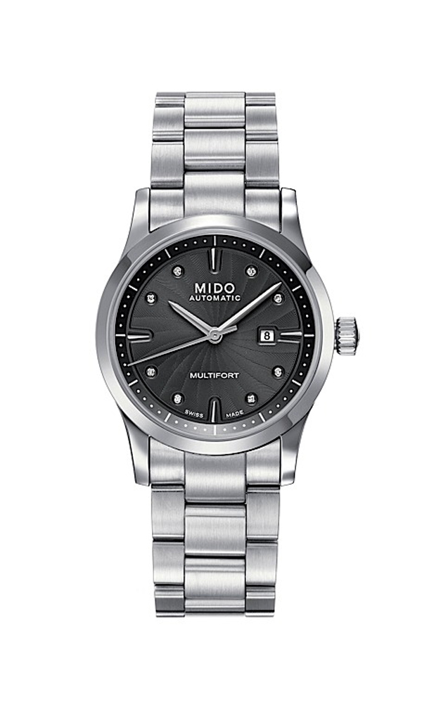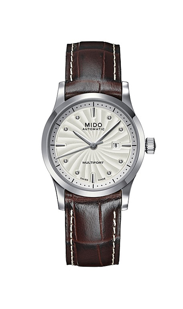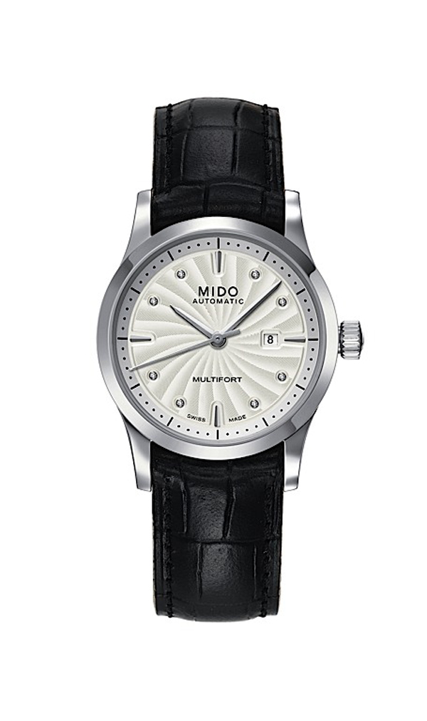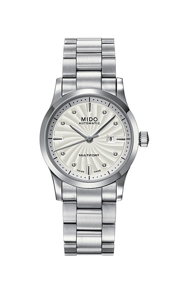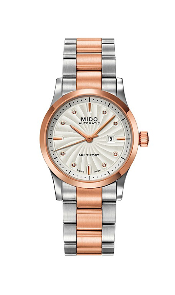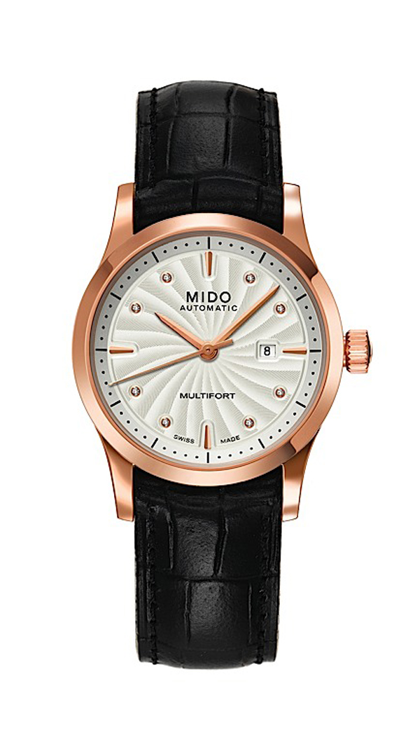 溫馨五月母親節MIDO美度表特別推薦全新Multifort Lady Diamonds先鋒系列女仕鑽錶,2011年先鋒系列女錶錶徑特別從38mm縮小至31mm、以更輕薄的錶身搭配PVD玫瑰金雙色鍊帶或皮革錶帶等多樣選擇,外觀以放射狀日內瓦波紋錶盤經典設計主導視覺,時刻上點綴韋塞爾頓Wesselton璀璨美鑽,尺寸縮小,更突顯優雅細膩質感。