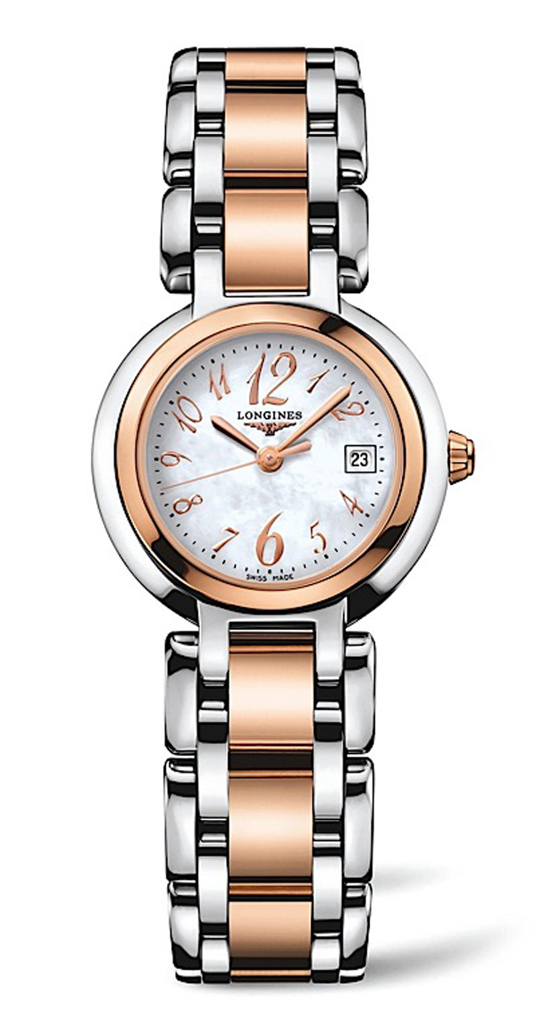 浪琴表為慶祝母親節特別推出「2011新月系列母親節限量腕錶」,選用耀眼奪目的玫瑰金與不銹鋼的雙色材質配搭的雙色鏈帶,搭配白色珍珠母貝面盤上為同樣玫瑰金色之立體阿拉伯時間刻度藝術字體,整只腕錶散發出高貴優雅、如同朝陽般璀璨溫暖的質感。