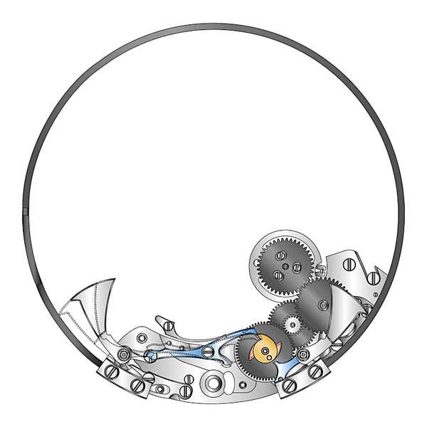左邊音槌每隔一小時敲響一次,右邊音槌則每刻鐘敲響一次。兩個音簧懸浮在錶盤和錶圈之間的凹陷之處,易於識別。每隔一刻鐘,機械裝置便會啟動,敲擊其中一個音簧。每一刻鐘會以高音調的樂聲報時,而每個整點則以低音調的樂聲報時。