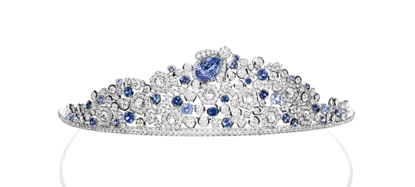 集結頂尖超凡工藝大師的耐心由工坊大師耗時超過600小時的專業巧手琢磨,並透過精密計算讓和諧的蜂巢幾何圖形架構出全新的<Bee My Love藍寶皇冠>,其停歇在皇冠頂端的蜜蜂是由5.49克拉的梨型切割藍寶石鑲嵌,可以拆卸當作胸針個別佩戴使用。