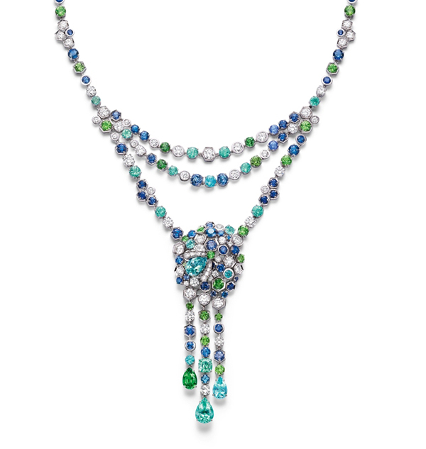 此外,透過另一出色的工藝,項鍊也藉由巧妙的手法拆成垂飾耳環,讓珠寶不再只有一種用途,而是不同形式的有趣的創意。CHAUEMT也利用多樣化的六角形、圓形以及梨形的車工,讓Paraiba藍碧璽、藍寶石到綠色沙弗萊石及鑽石在色彩上呈現出微妙的層次變化。