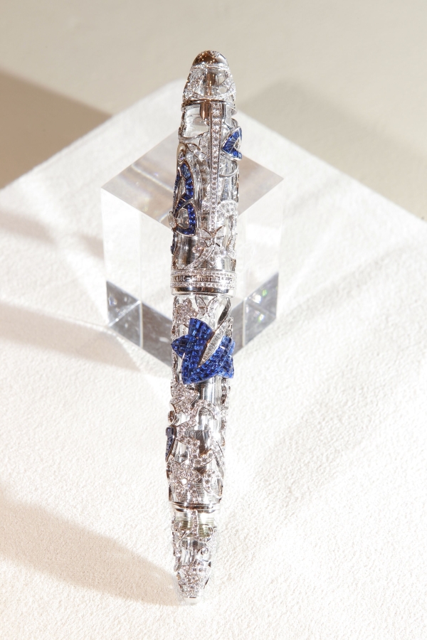 18K白金鏤空雕刻筆身,鑲嵌825顆圓鑽,加上欖尖形及長階梯形切割鑽石,共約10.22克拉,68顆藍寶石裝飾葉子,採神秘鑲嵌法,約4.68克拉,189顆藍寶石裝飾蝴蝶,約8.3克拉,價格約新台幣2千6百萬。