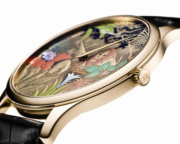 蕭邦L.U.C XP Urushi率先將這項珍貴的漆繪工藝引入面盤裝飾之中。早在2008年,蕭邦就先行製作了幾款漆繪腕錶,但僅在日本市場推出。如今,蕭邦再次推出9款漆繪珍品,包括9個不同面盤主題。面盤設計及繪製均由漆藝大師增村紀一郎先生親自完成,而金粉裝飾部分則由日本皇家御用大師,同時也享有國寶之稱的漆器製造商山田平安堂(Yamada Heiando)精心製作。其中五款的創意靈感來自中國古老哲學中的宇宙基本元素—「五行」,即金、木、水、火、土,分別對應五種靈獸:臥虎、藍角龍、玄武蛇龜獸、鳳凰、月色麒麟。第六款面盤主題為夜空,餘下三款則是孔雀、金魚和叢林。每一款面盤都經手工精描細畫而成,獨一無二,每一處細節皆值得細細品味,韻味無窮。