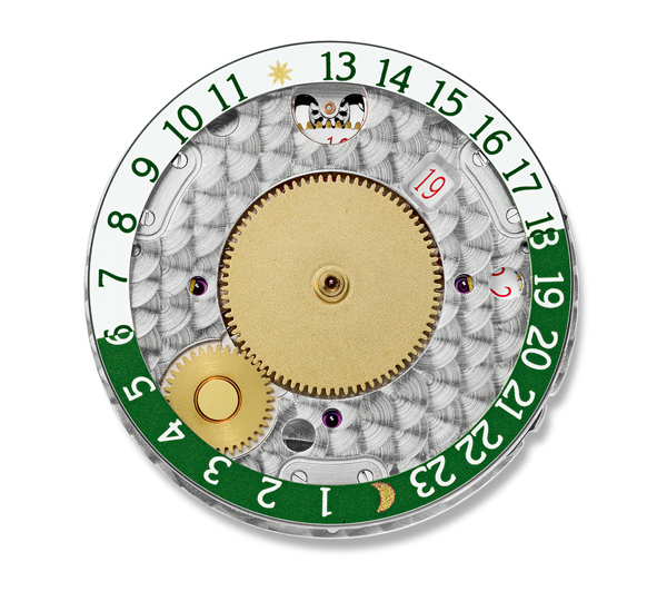 Girard-Perregaux自製GP033C0高級機芯結合計時碼錶與日期功能、以及世界時區顯示。表面處理透過藍寶石水晶玻璃背蓋一覽無遺,展現該品牌最優質傳統:主板上也清楚刻印環狀花紋,錶橋和擺輪上的日內瓦印記 (Côtes de Genève) 、藍鋼螺絲以及大型錶殼採用霧面處理,強調設計的精巧特質,24小時外環上的綠白對比裝飾則代表對綠色拍賣理念的禮讚!