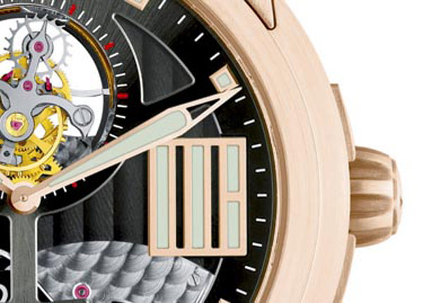 圖文:鏤空的大日期視窗,大方地呈現出組成日期的兩片數字轉盤,以及機芯基板上的打磨,簡單的設計表現出L-Evolution系列的前衛機械質感。