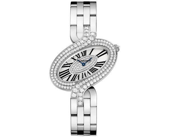 圖文:Délices de Cartier珠寶腕錶,大型款,鍍銠18K白金,錶圈鋪鑲美鑽,盤面半鋪美鑚。錶殼:鍍銠18 K白金– 尺寸:寬:38.39毫米(含錶冠) – 長:43.81毫米– 厚:7.60毫米– 錶圈:鑲嵌圓鑽 – 錶盤:鍍銠18 K白金,鑲嵌圓鑽- 錶鏡:藍寶石水晶 – 防水深度:30 米/ 100英尺/ 錶帶:鍍銠18 K白金– 錶扣:鍍銠18 K白金 – 機芯:石英機芯 – 鑽石總重:2.15克拉。參考價格約 $1,990,000。