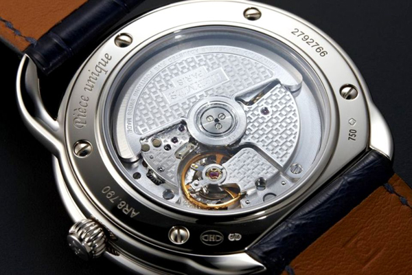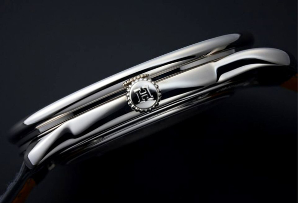而本款腕錶除了使用珍貴的填充琺瑯彩繪面盤之外,錶殼內部搭載的H1928自動上鍊機芯,同樣是來自於Vaucher高級機芯廠的產品,其直徑為25.6mm,厚度為3.5mm,具有雙發條盒設計。與先前的H1928自動機芯相比,本款腕錶使用的H1928自動機芯,是沒有大秒針以及日期功能的兩針款式,主要的考量是為了避免妨礙使用者欣賞琺瑯彩繪面盤,畢竟這才是本款腕錶的最大賣點。而錶殼採用螺絲鎖入式透明底蓋,可以觀賞使用特殊H字樣的機芯雕飾處理,以及上鍊效果順暢的K金材質自動盤。