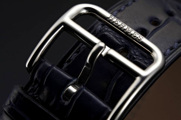 圖說:本系列錶款除了將馬鐙造型運用在錶耳之上,同時也將此一概念運用於錶扣上。本只腕錶使用的18K白金針扣,上端的結構就如同馬鐙造型,上方並鐫刻了HEREMS的字樣。