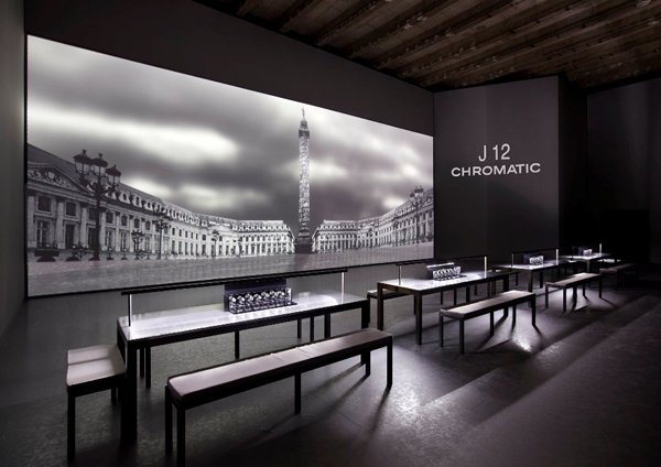 展場以J12 腕錶及鈦陶瓷的特質為概念發想,以四大主題裝置呈現。首先經過運用大量鏡面反映暴風天際的長廊,呈現J12 Chromatic鈦陶瓷完美的鏡面反射,隨環境變化,而展露出變幻莫測的色彩。接著引領大家來到一個以代表香奈兒的黑白兩色呈現且充滿12的空間,視覺與聽覺上闡述12所象徵的意義,如12星座、12個時辰、一年有12個月等;不但在意象上展現了J12與時間的密切關係,同時也代表自2000年J12上市,自此數字12在腕錶界有如數字5在香水界的重要象徵性。