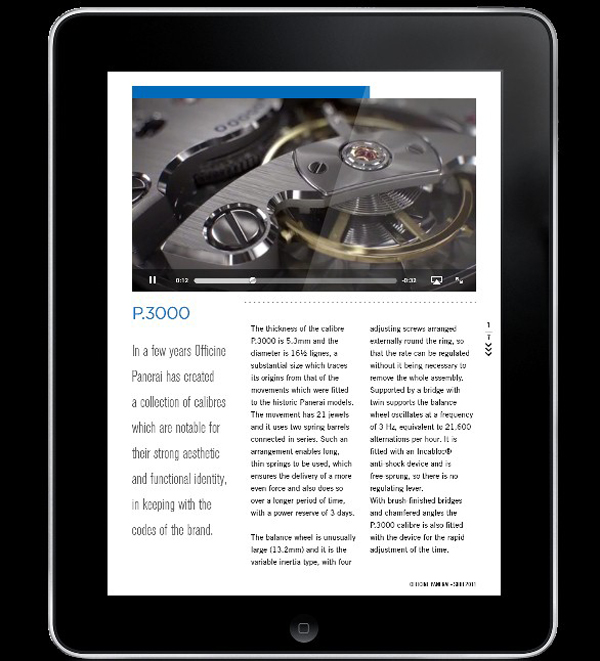 Panerai Magazine載有大量的圖片、短片和文章,沛納海錶迷可以從中欣賞到這個源於佛羅倫斯腕錶品牌的最新力作,讀取相關的詳細規格,當然還有很多其他精彩資訊:例如完全由諾沙泰爾(Neuchâtel)錶廠所研發製造、動力儲存達三天的全新P.3000手動上鏈自製機芯的技術規格;沛納海腕錶錶殼所採用創新材質的性能和特點;沛納海腕錶的各處細節和其源遠流長歷史之間的關聯。Panerai Magazine是沛納海繼2010年的iPhone程式之後,第一個專程為iPad推出的應用程式,可經由以下連結免費下載使用: